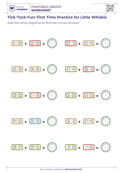 Whizki Learning Tick-Tock Time Fun worksheet introduces 4-year-old children to reading clocks by connecting clear digital times with friendly analog clock faces. Each activity page focuses on a single skill step, supporting first-grade math readiness while keeping early learning playful and low-pressure.