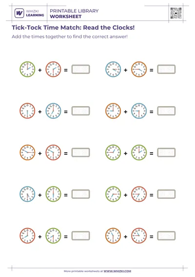 Families and classrooms benefit from the Whizki Learning printable time worksheet because flexible design fits many schedules and teaching styles. Caregivers and teachers can use the Whizki Learning printable time worksheet for quick math warm-ups, homework support, center activities, or quiet-time review. Reproducible format allows families to print multiple copies, giving each child repeated practice with different clock times until understanding becomes secure.