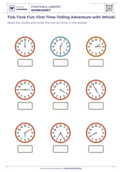 Every activity on the Whizki Learning worksheet is crafted to support both home and classroom use with minimal adult preparation. Parents and teachers can quickly present the clocks, ask children to read the time, and guide children to write matching digital numbers, reinforcing math vocabulary such as “hour,” “minute,” “o’clock,” and “half past.” Consistent format across all problems helps young learners stay focused on time-reading skills rather than decoding complex directions.