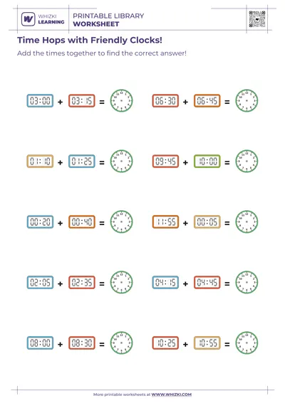 This Whizki Learning time practice worksheet fits easily into home learning routines, math centers, or small-group instruction, giving caregivers and teachers a ready-to-use resource that reinforces daily schedule awareness. Adults can extend learning by asking the child to connect each worksheet time to real-life events, such as snack time or bedtime, deepening the child’s understanding of how clocks organize the day. The printable format allows families and classrooms to revisit time-telling practice across multiple sessions for stronger long-term mastery.