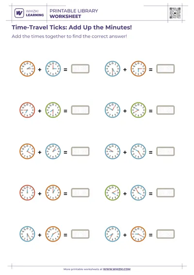 The Whizki Learning worksheet introduces early addition of minutes by prompting children to combine two simple times, preparing brains for later elapsed-time problem solving.