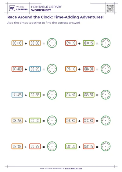 This specific Whizki Learning worksheet is designed with a gradual mix of hour-only and hour-plus-minute additions, so children practice reading analog clocks, mentally adding time, and confidently converting the result into digital format all on one clean, no-distraction page.