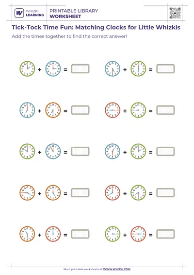 The Whizki Learning worksheet introduces time addition by pairing two clocks, encouraging the child to visualize short future moments like snack time or story time.