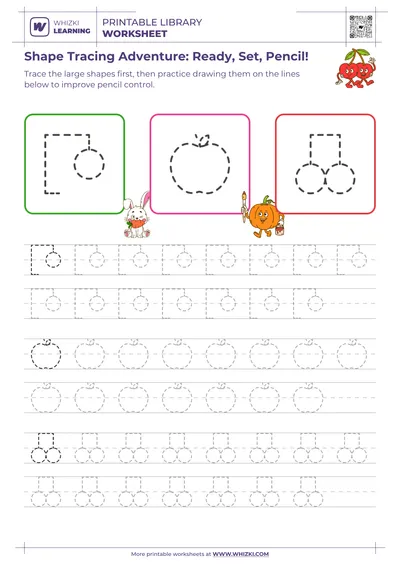 Whizki Learning tracing shapes and objects practice targets fine motor development and pencil control through carefully graded paths. Each line, curve, and corner on the worksheet asks the child to slow down, follow a direction, and stay on track. Occupational therapists and literacy specialists frequently recommend tracing tasks to strengthen the small hand muscles that support legible handwriting. The Whizki Learning printable worksheet gives young learners structured repetition without overwhelming the child with dense text or complex instructions.