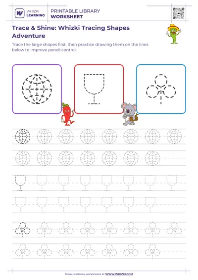 The Whizki Learning tracing worksheet gives 3-year-old children a playful path into pre-writing by inviting careful tracing of simple shapes and familiar objects. Early childhood educators designed the Whizki Learning activity to develop pencil control, hand strength, and visual focus in a calm, confidence-building way. Every stroke on the Whizki Learning worksheet prepares the child for future letter formation and early reading tasks such as tracking print from left to right.