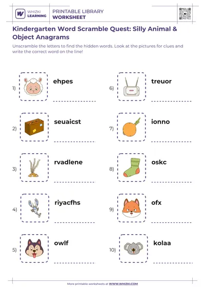 The Whizki Learning Word Scramble Adventure worksheet gives 6-year-old first graders a playful way to explore anagrams, spelling practice, and early vocabulary building. The Whizki Learning activity turns scrambled words into a puzzle challenge that encourages young readers to sound out letters, notice patterns, and write correct word forms. Educator-designed instructions keep directions clear and age-appropriate, so first grade learners build foundational reading and writing skills while enjoying a fun, game-like experience.