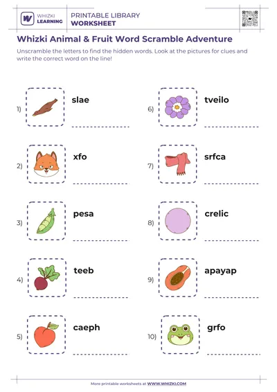 The Whizki Learning word scramble worksheet also expands vocabulary by introducing both common and slightly challenging words within a safe, supported format. Scrambled examples such as food items, nature words, and household objects encourage curiosity, questions, and discussion about meanings. Children gain experience working with unfamiliar letter combinations, strengthening phonics knowledge, visual discrimination, and flexible problem-solving strategies that transfer to independent reading and future spelling tasks.