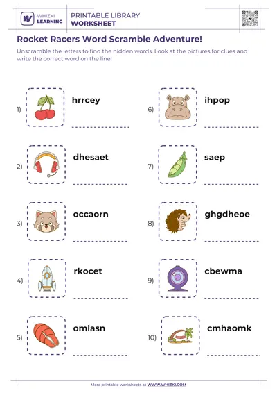 Whizki Learning created this word scramble worksheet to turn early reading practice into a playful puzzle for young minds aged 4 and up. Each scrambled word comes from familiar, concrete objects such as popcorn, salad, and mitten, helping the child connect printed words with real-world experiences. By searching for correct spellings inside each scramble, the child strengthens early decoding skills, phonics awareness, and word recognition in an engaging, low-pressure format.