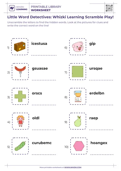 Early literacy specialists at Whizki Learning created the word scramble worksheet to strengthen letter recognition, initial sounds, and vocabulary by guiding the child to rearrange jumbled letters into real words.