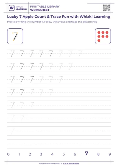 Educator-designed structure in the Whizki Learning Zero Apples worksheet includes large stroke-guides for tracing, dotted outlines for independent practice, and friendly apples for counting, circling, and coloring activities.