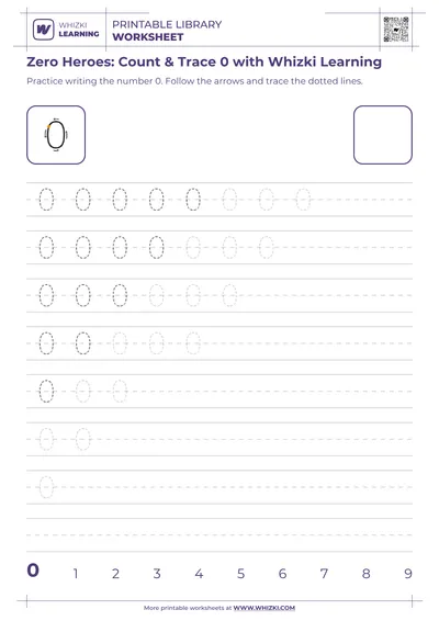 Whizki Learning tracing page -> fine-motor control -> stronger pencil grip and hand coordination as the child follows smooth paths forming the numeral 0.